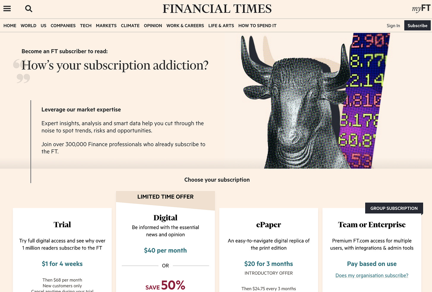 Вслед за колонкой NYT про темные паттерны в интерфейсах, появился текст на Financial Times про «пристрастие к подпискам». Говорят, интересный, но прочитать его без подписки нельзя. И NYT, и FT знамениты совершенно бесчеловечным процессом отказа от подписки – это можно сделать только по телефону и вас десять раз попробуют переубедить.