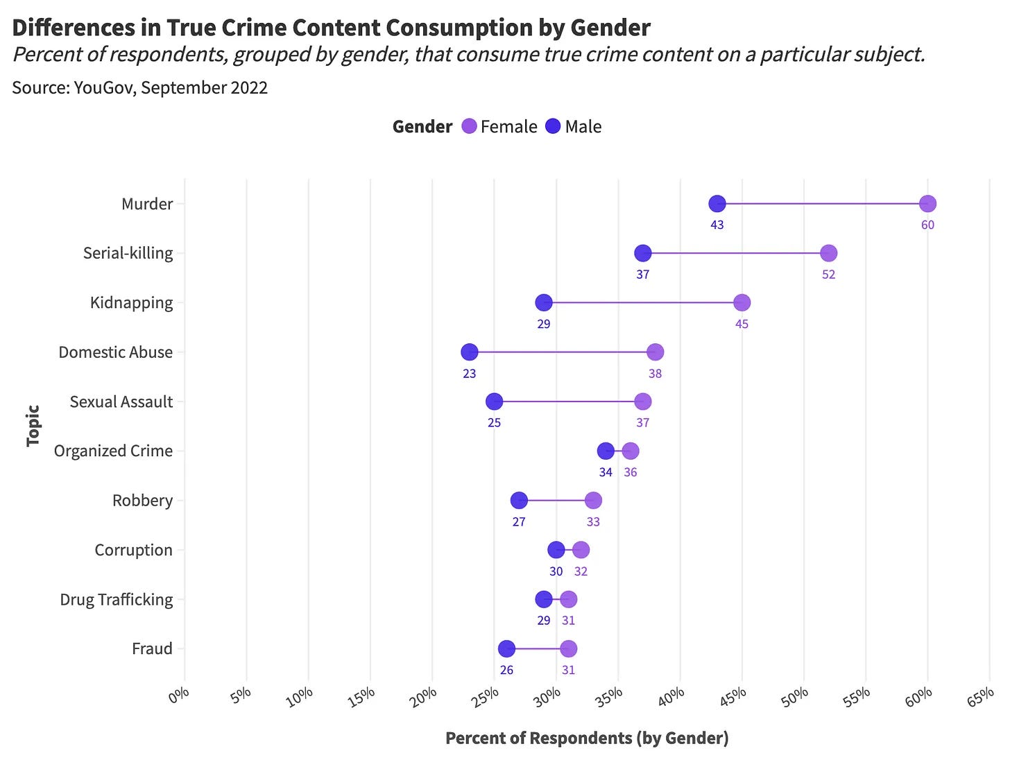 Женщины больше любят читать и смотреть документальные истории про убийства, чем мужчины. И другая познавательная статистика про этот жанр.